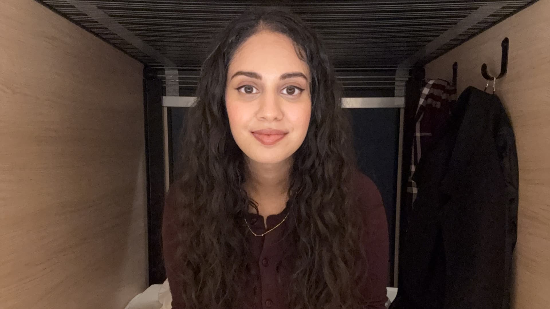 Although I can feel my luggage — a backpack and tote bag — at the end of my bed, and the bottom of my coat hung on the hooks, I’m surprised by how comfortable and cozy the bedding is.