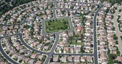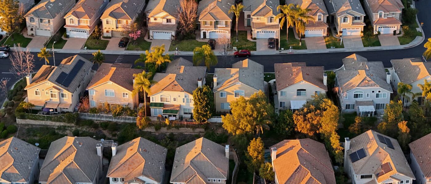 In an aerial view, two-story single family homes line the streets of neighborhood on Jan. 13, 2026 in Thousand Oaks, California.